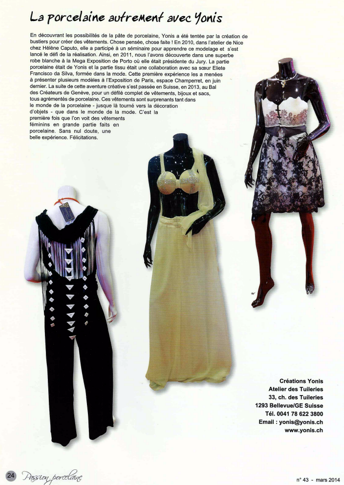 En découvrant les possibilités de pâte de porcelaine, Yonis a été tentée par la création bustiers pour créer des vêtements. Chose pensée, chose faite ! En 2010 dans l’atelier de Nice chez Hélène Caputo, elle a participé à un séminaire pour apprendre ce modelage et s’est lancé le défi de la réalisation. Ainsi, en 2011, nous l’avons découverte dans une superbe robe blanche à la Mega Exposition de Porto où elle était présidente du Jury. La partie de la porcelaine était de Yonis et la partie tissu était une collaboration avec sa sœur Eliete Francisco da Silva, formée dans la mode. Cette première expérience les a menées à présenter plusieurs modèles à l’Exposition de Paris, espace Champerret, en juin dernier. La suite de cette aventure créative s’est passée en Suisse, en 2013, au Bal des Créateurs de Genève, pour un défilé complet de vêtements, bijoux et sacs, tous agrémentés de porcelaine. Ces vêtements sont surprenant tant dans le monde de la porcelaine – jusque là tourné vers la décoration d’objets – que dans le monde de la mode. C’est la première fois que nous voyons des vêtements féminins en grande partie fait en porcelaine. Sans nul doute, une belle expérience. Félicitations.