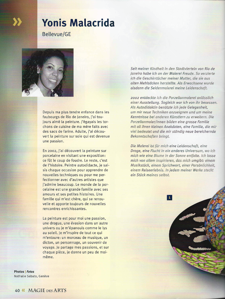 En 2002 j’ai découvert la peinture sur porcelaine en visitant une exposition: ce fût le coup de foudre. Le reste, c’est de l’histoire. Peintre autodidacte, je saisis chaque occasion pour apprendre de nouvelles techniques ou pour me perfectionner avec d’autres artistes que j’admire beaucoup. Le monde de la porcelaine est une grand famille avec ses amours et sers petits histoires. Une famille qui m’est chère, qui se renouvelle et apporte toujours de nouvelles rencontres enrichissantes.