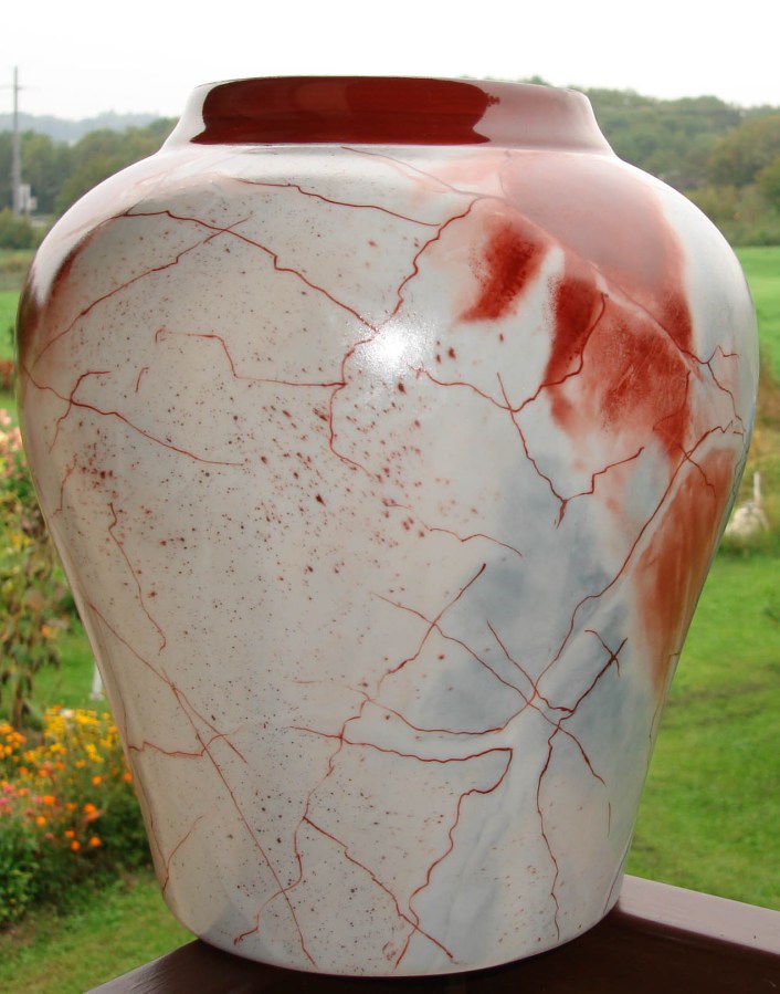 Vase de style marbré couleur gris et rouge. Dimensions: hauteur 20cm, largeur/profondeur 17 cm. Technique: copaíba.